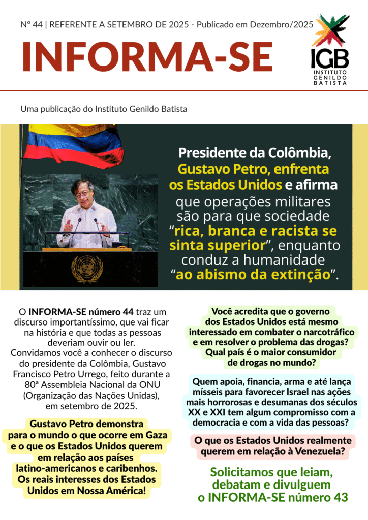 INFORMA-SE NÚMERO 44 – SOBERANIA E PAZ! No momento em que se comemora o Natal e o Ano Novo que chega, perdemos a conta do número de vezes em que desejamos a PAZ para as pessoas, para as famílias, para as comunidades, para os municípios, Estados e para os Países. Não temos ideia do número de felicitações de PAZ que recebemos direta ou indiretamente! No momento em que externamos com palavras, atos, pensamentos o desejo de PAZ e em que vemos a GUERRA instalada em nosso CONTINENTE, com os nossos desejos de PAZ lhe ofertamos o INFORMA-SE número 44, com o discurso do Presidente da Colômbia, Gustavo Petro. Para conquistarmos e assegurarmos a PAZ precisamos conhecer a realidade a partir de quem a vive concretamente e não das informações distorcidas que nos chegam. Precisamos saber quais os reais interesses de quem promove os conflitos, as guerras, os genocídios, acabando com a PAZ entre as pessoas.QUE TENHAMOS UM FELIZ NATAL E UM ANO NOVO DE PAZ E PROSPERIDADE! Solicitamos que leiam, debatam e divulguem o INFORMA-SE 44.